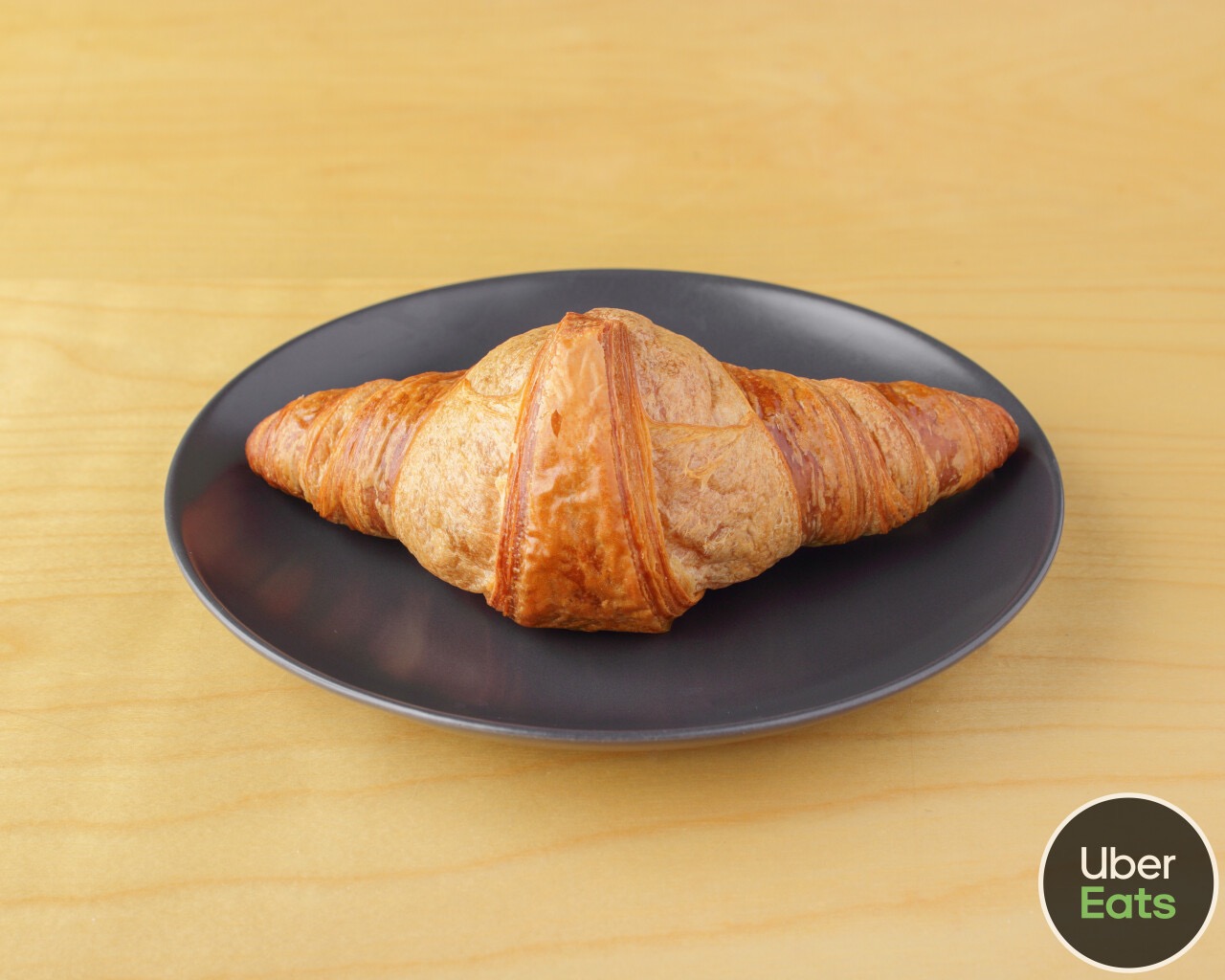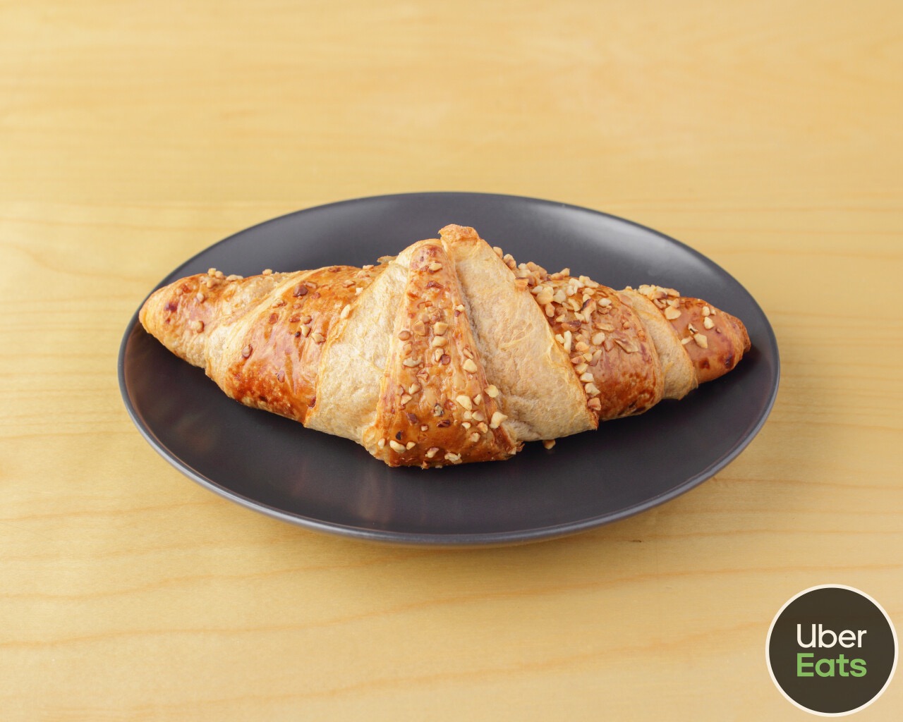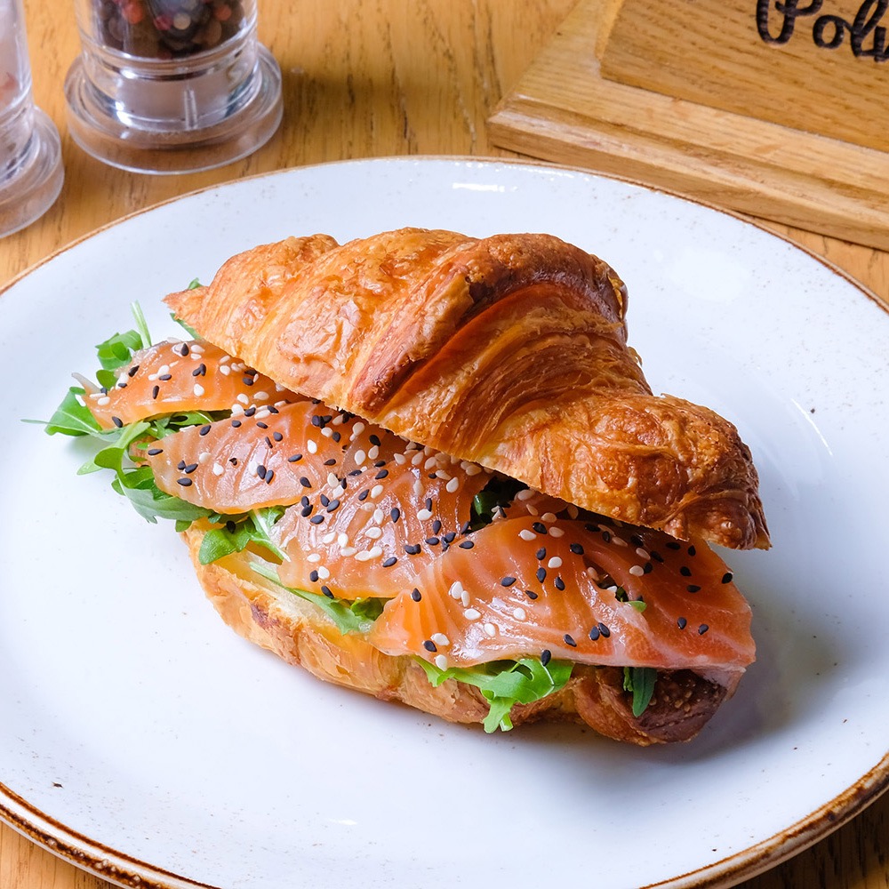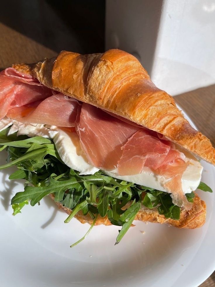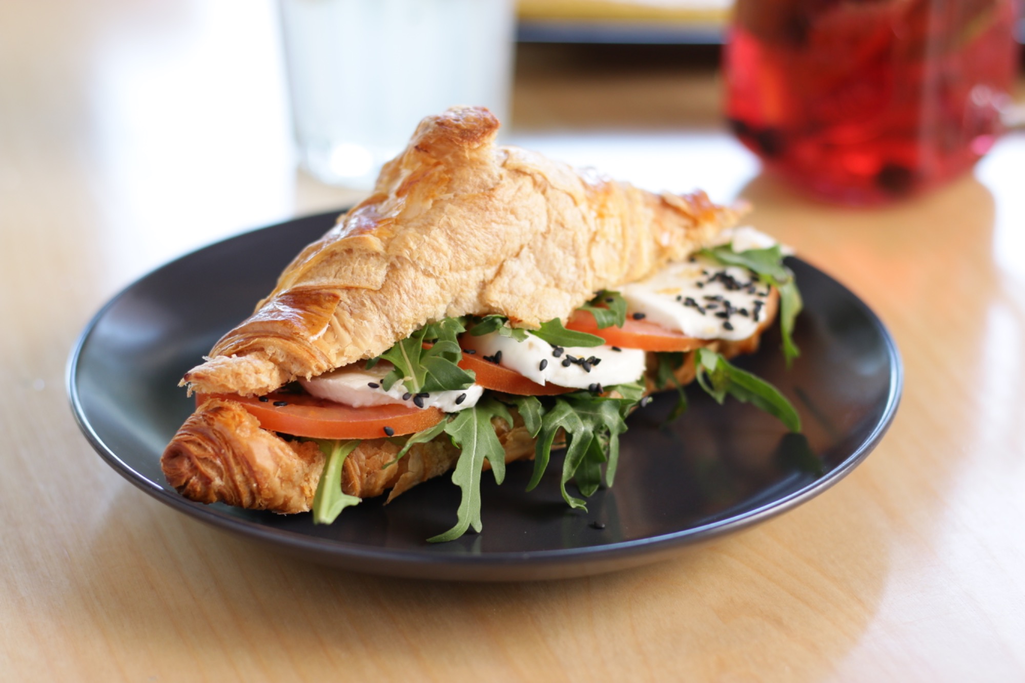 rogalik z ciasta francuskiego, szynka, ser tostowy, liście sałaty, pomidor świeży