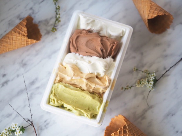 Krem mascarpone , krem z białej czekolady z chrupkami ryżowymi, krem z pistacji .